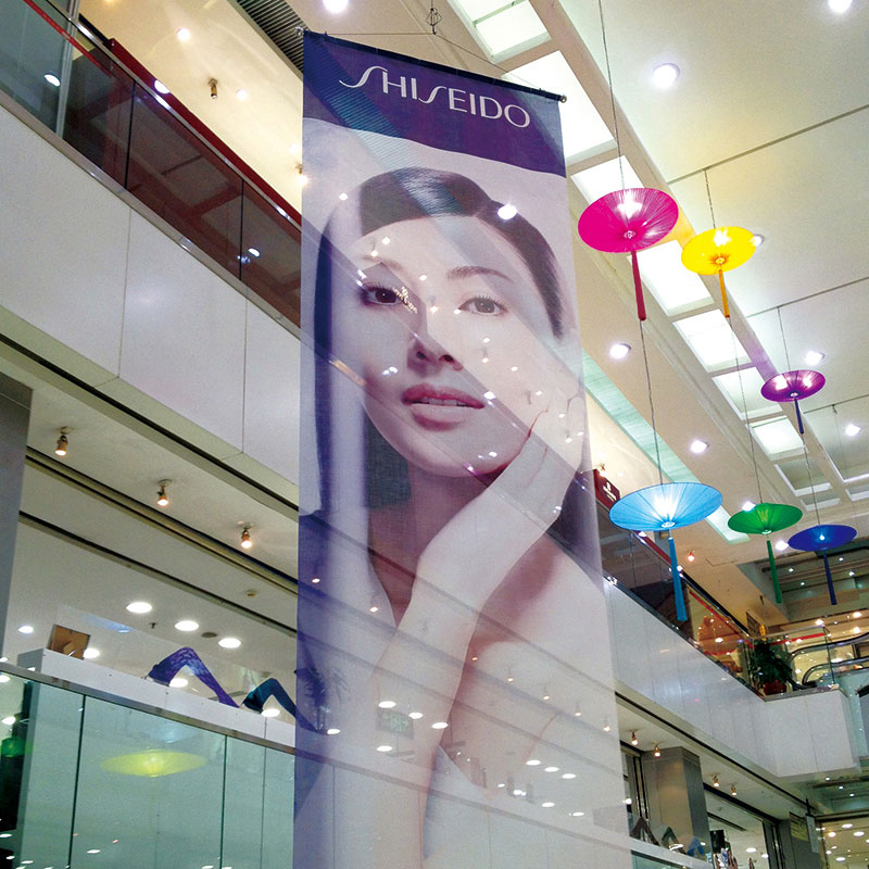双面网格布广告画:我司网格布的双面喷印技术主要应用于珠宝、钟表、银行、化妆品等广告应用。