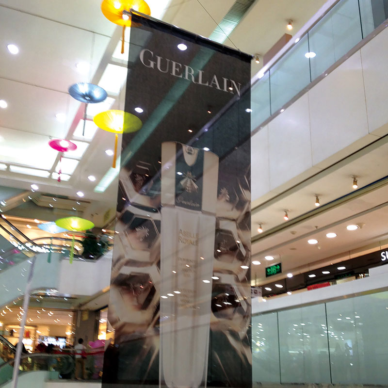 应用:商场中庭悬挂广告,楼体防风广告,装饰艺术窗帘。