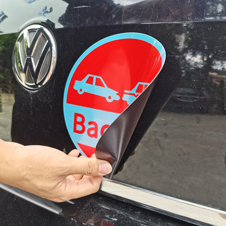 我们的磁贴是由磁粉和乙烯基制成的。它的粘合面有纹理,安装时可以很容易地去除气泡。你可以把它放在任何含有铁材料的表面上,如汽车、卡车、冰箱等。当不想使用它时,可以把它取下,它不会损坏车体,冰箱表面,可以重复使用。我们可以全彩色打印,也可以裁剪成任何形状。有三种薄膜选择:哑光/光泽和反光。