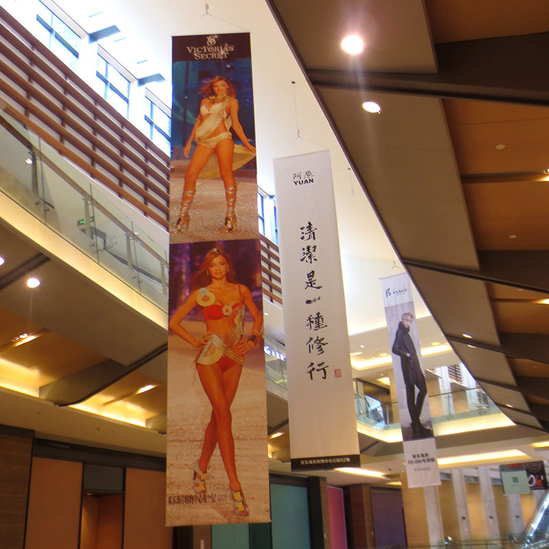 商场双面大吊旗喷绘,可以两面喷绘,广告效果好,画面不卷边,平整。是商场中庭吊旗应用的经典案例。也广泛用于银行、宾馆、写字楼的窗帘,以及灯杆旗,既能做广告,又能遮光。